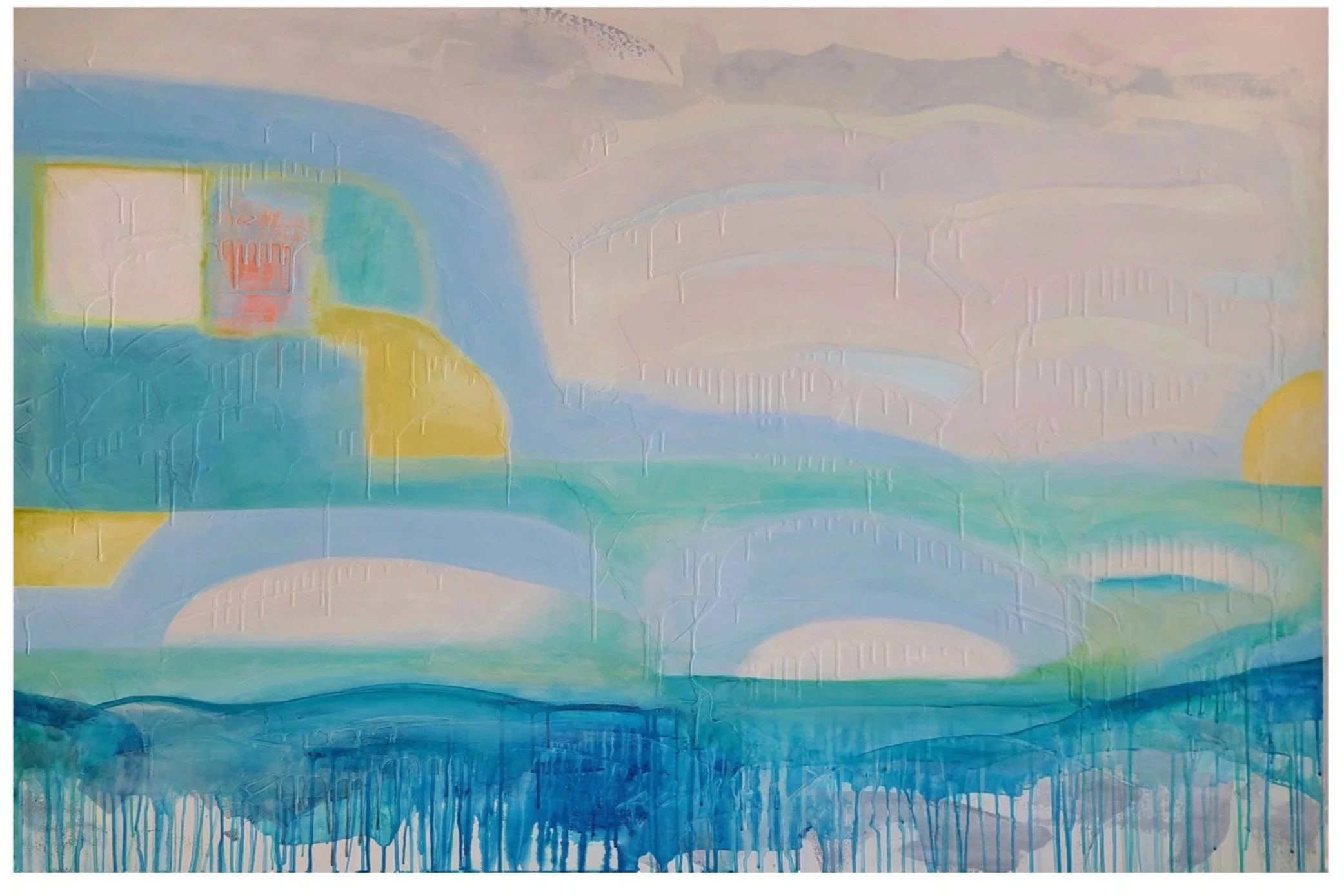 An abstract painting by Linds Miyo featuring soft pastel shapes of yellow, blue, white and grey.