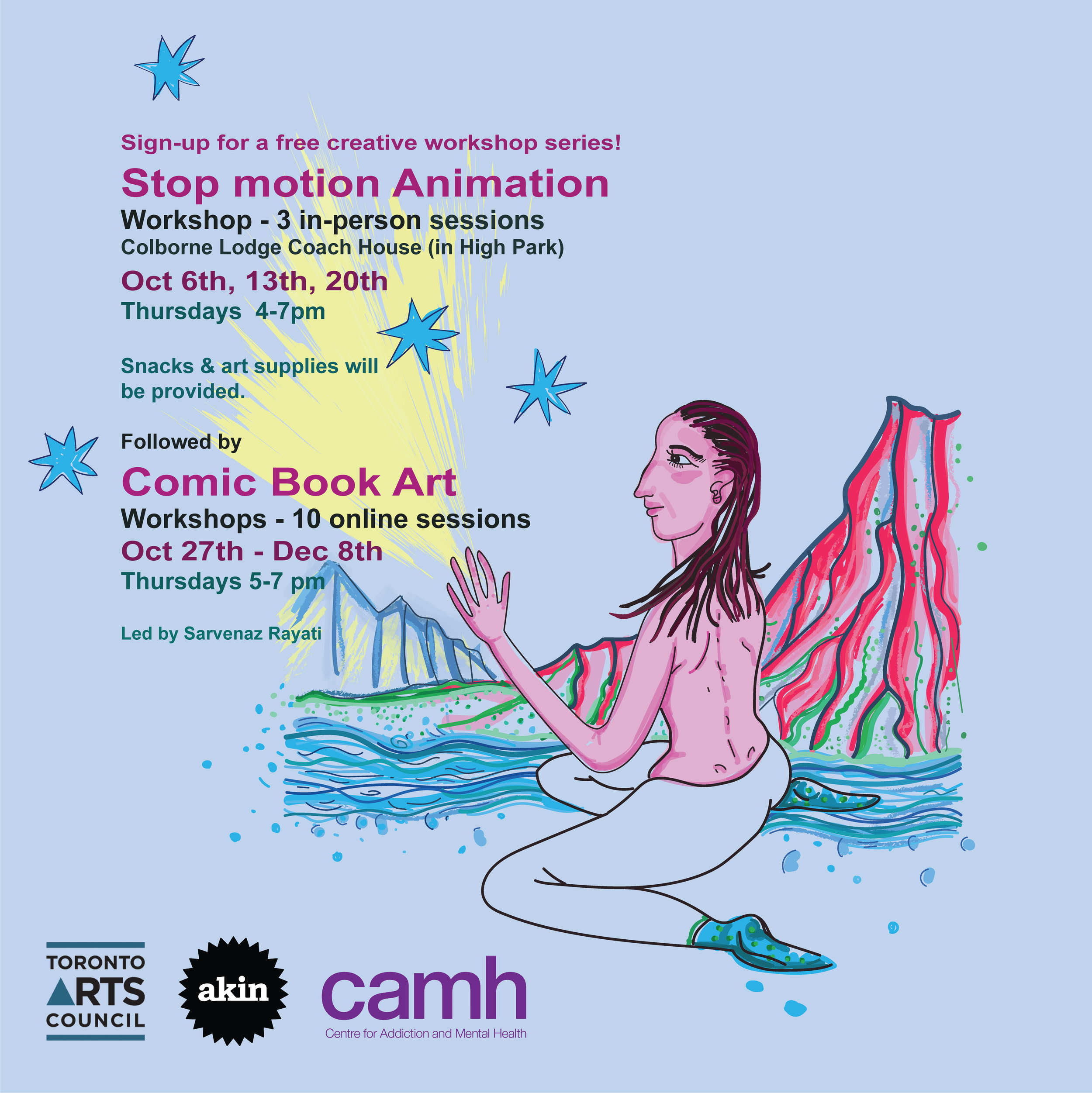Creative activity is known to boost your health and happiness, and sometimes one just needs a guiding hand to find your own artistic voice! Work with professional artists Sarvenaz Rayati and Erin Candela to learn about different techniques and tools which can develop and guide your creative expression through the world of Comics and Stopmotion Animation. This is a beginner level introduction to comics and participants only need to show up and bring their ideas. This series offers 3 in-person sessions, with 7 sessions online to follow, taking place on Thursdays starting October 6th through December 8th.